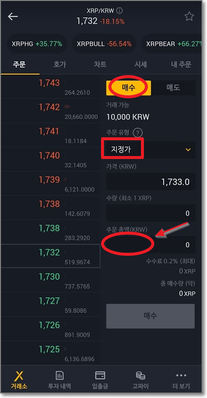 앱의 하단에 "거래소"를 누르면 아래처럼 코인들이 보이는데요. 여기서 사고자 하는 코인의 이름을 누릅니다. 저는 "리플"을 눌러보겠습니다. 다음 화면이 오른쪽처럼 나오는데요. 맨 위에 "매수"가 보이시죠? 매수가 산다는 것입니다. 옆에 매도는 판다는 것이지요. 매수가 선택된 상태에서 거래가능 금액은 아까 입금한 1만 원이 보이네요. 그 밑에는 우선 "지정가"로 해봅니다. 그 아래 가격은 놔두시고 수량도 놔두시고 주문 총액의 빈칸을 터치합니다.
