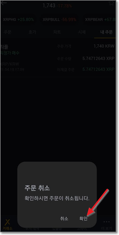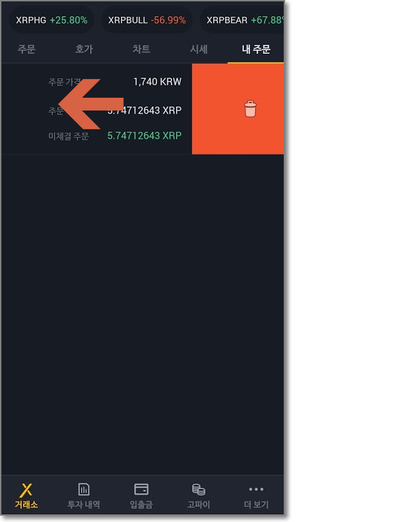 내주 문을 삭제해야 하는 이유는 만약 1만 원을 사겠다고 주문을 내놓은 게 있으면 실제로 사지 지는 않았지만 예약이 걸려있는 것과 마찬가지라서 더 이상 살 수가 없습니다. 그래서 지워야 하는데요. 이미 내놓은 주문을 지우는 법은 왼쪽으로 스와이프(밀어내기)하면 빨간색과 함께 휴지통이 나옵니다. 이 휴지통을 누르면 주문을 취소하겠냐고 물어보는 창이 나오며 "확인"을 누르시면 됩니다.