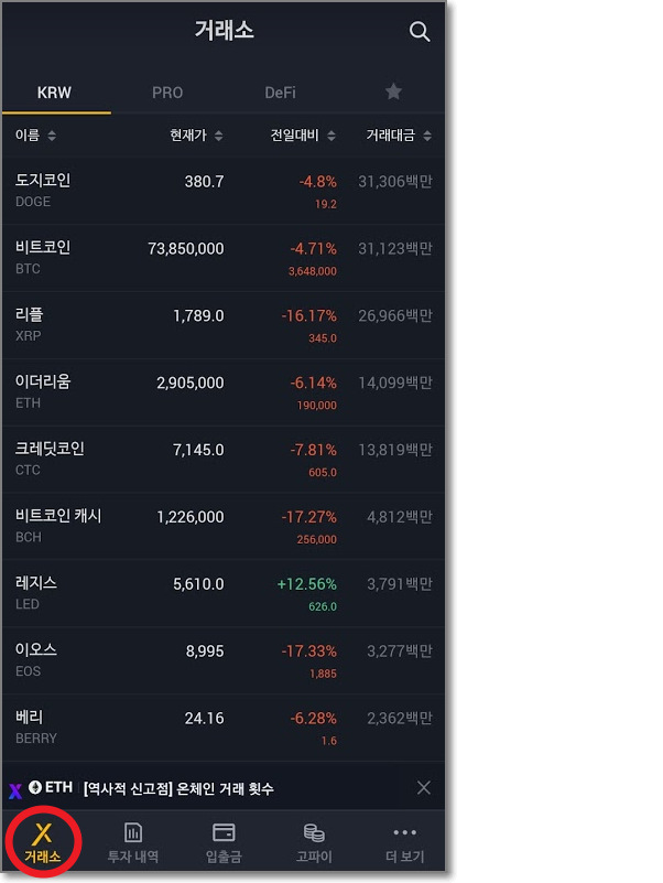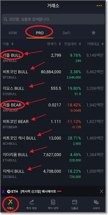 고팍스 앱의 하단에 "거래소"에서 상단에 PRO탭을 누르면 나타나는 것이 불/베어 마켓입니다.