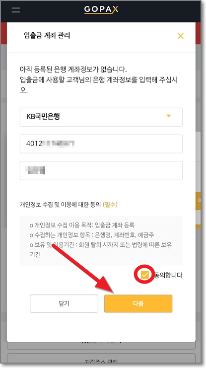 계좌 등록을 누르면 잠시 앱에서 빠져나와서 다시 모바일 웹이 열리는데요. 여기서 "계좌 등록"을 누릅니다. 계좌는 타 거래소와 달리 본인의 아무 계좌나 등록이 됩니다. 여기서는 국민은행으로 등록을 해보았습니다. 은행 선택하고 계좌번호 입력하고 본인 이름 입력하고(본인만 됩니다. 타인 이름으로 등록 안돼요) 개인정보 수집 및 이용에 대한 동의를 체크하시고 "다음"을 누릅니다.