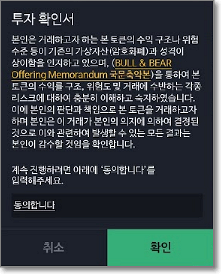 하지만, 사실 고팍스에 있는 불 베어 마켓은 가능하면 들어가지 않으시는 것을 추천드립니다. 3배 변동성이 있기 때문에 3배로 수익이 날 수도 있지만 반대로 리스크도 3배이기 때문에 원금이 전액 손실 날 수도 있습니다. 그래서 불 베어 마켓에 들어가려고 하면 아래처럼 "투자 확인서"에 "동의합니다"라고 직접 입력을 해야 들어갈 수 있습니다.
