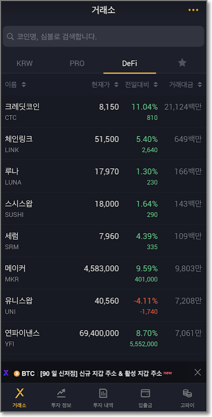 그리고 체인링크나 세럼은 업비트에도 있는 코인이며 디파이의 의미를 살리지 못하고 일반 코인과 함께 움직이고 있는 상황입니다.