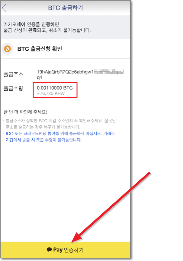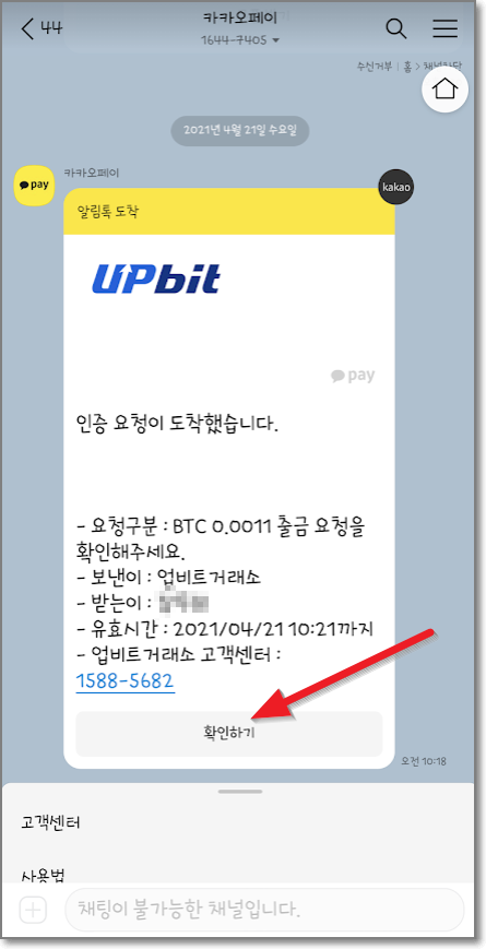 업비트에서는 암호화폐를 출금할 때나 원화를 출금할 때 카카오페이 인증을 거치는데요. Pay 인증하기를 누르고 카카오톡으로 가서 인증 요청에 대해서 "확인하기"를 누릅니다.