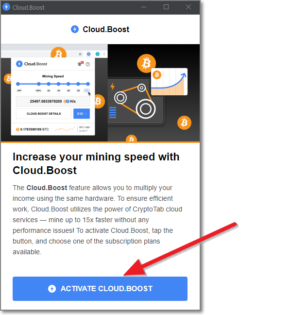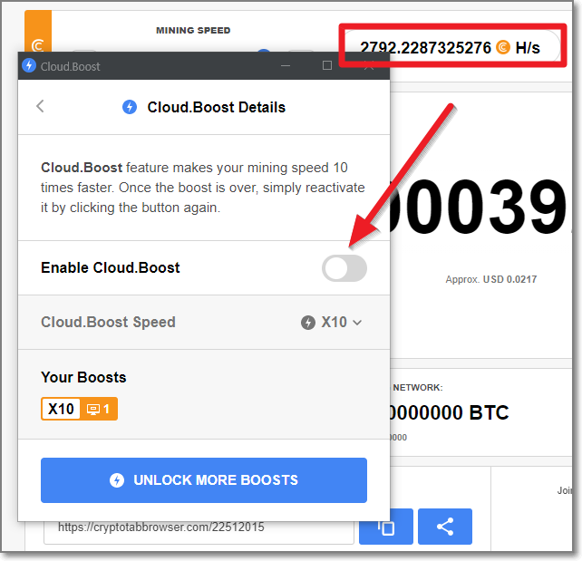 크립토 탭은 무료로 사용할 수 있지만, 만약 해시값이 느리다고 생각이 된다면 밑에 있는 Cloud Boost를 사용할 수 있는데요. 잠시 CLOUD.BOOST를 활성화시키는 법에 대해서 알아보겠습니다.