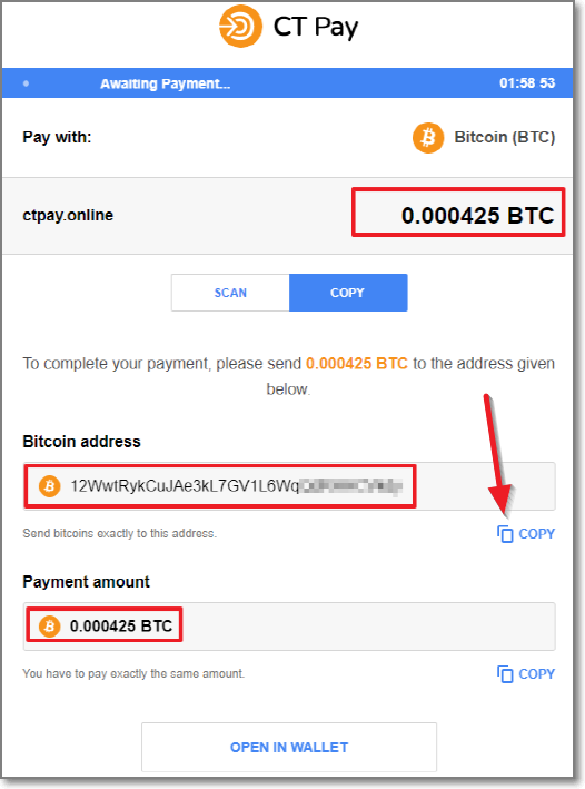 QR코드가 나올 텐데요. 휴대폰에 비트코인 지갑과 비트코인이 조금 있다면 바로 결제할 수 있지만 여기서는 주소로 입금을 진행해보겠습니다. QR코드 위에 있는 글씨중에 COPY를 누르면 오른쪽처럼 비트코인 주소와 0.000425비트 코인을 입금하라고 나옵니다. 이제 0.000425비트코인을 이 주소로 옮기면 됩니다.