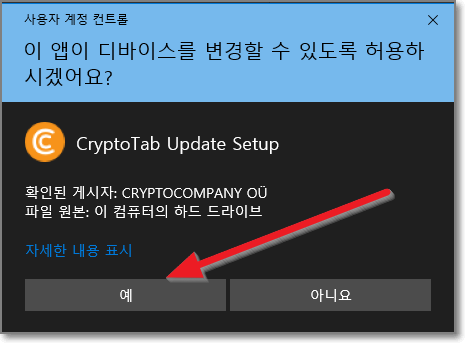 아래처럼 "이 앱이 디바이스를 변경할 수 있도록 허용하시겠어요?"라는 질문에 "예"를 누릅니다.