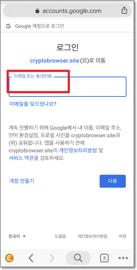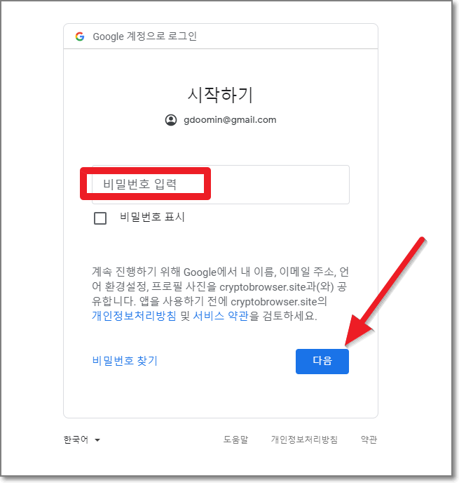 구글 아이디를 쓰고 "다음"을 누른 후 비밀번호를 입력하고 "다음"을 누릅니다.