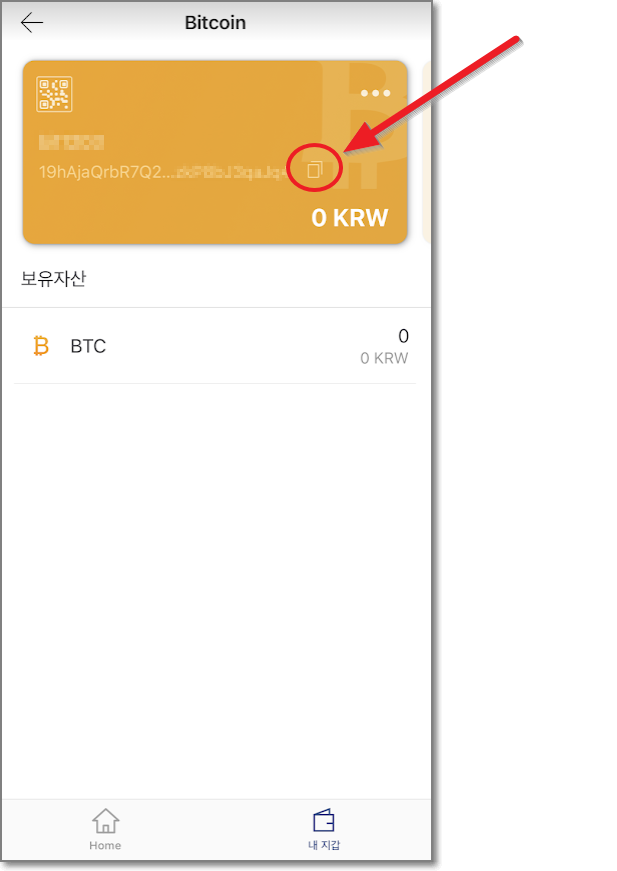 코인어스 앱에서 비트코인을 누릅니다. 비트코인 지갑이 열리면 보유자산 밑에 BTC를 누릅니다.