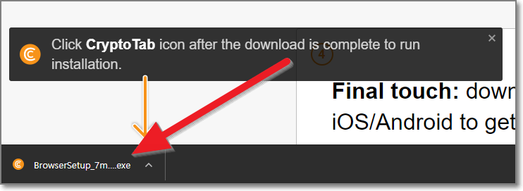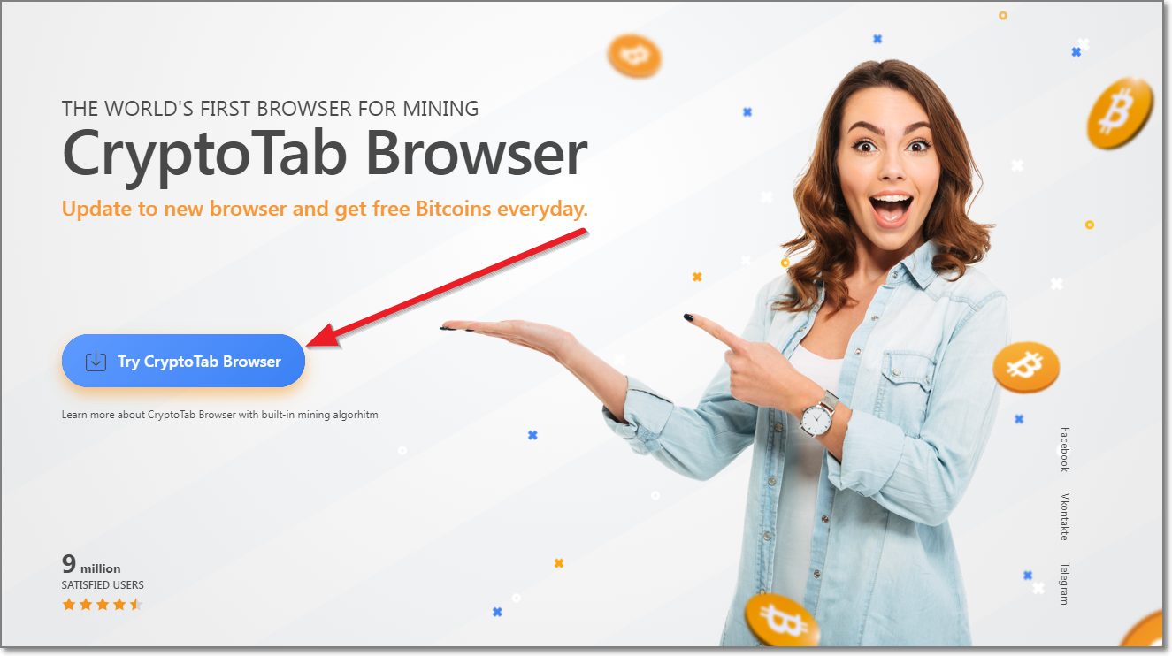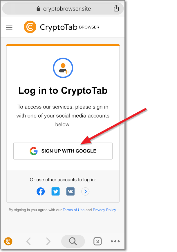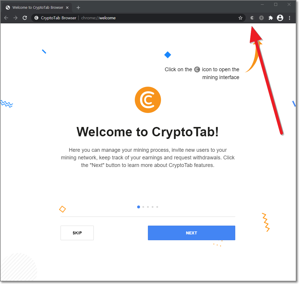 설치가 끝났습니다. 아주 간단하죠? 아래처럼 크롬 기반의 인터넷 브라우저가 생긴 것입니다. 여전히 이곳에서 웹서핑(뉴스 보기, 커뮤니티 참여하기, 유튜브 보기, SNS 하기 등)을 할 수 있습니다. 그런데 어떻게 채굴되는지 보고 싶으시죠? 아래처럼 빨간 화살표가 가리키는 크립토 탭 아이콘을 눌러보세요.