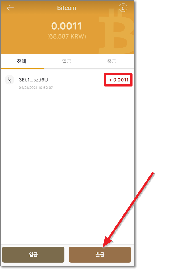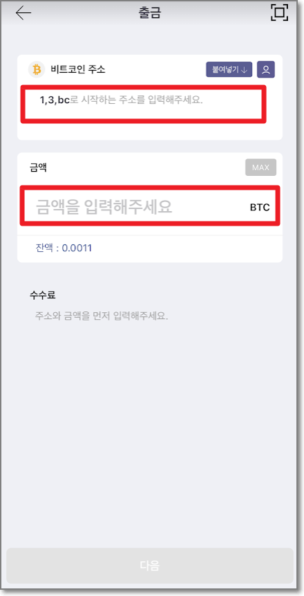 현재 금액이 0.0011BTC가 있는 것을 볼 수 있는데요. 밑에 있는 "출금"을 누르면 아래 오른쪽 그림처럼 "비트코인 주소"와 "금액"을 입력하라는 화면이 나옵니다.
