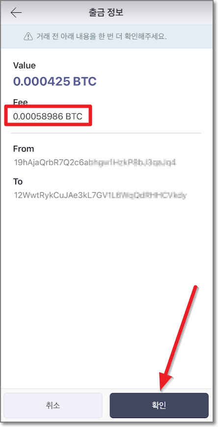 비트코인 주소도 붙어넣기 했고 금액도 딱 맞춰서 0.000425를 입력했습니다. "다음"을 눌러보면 수수료가 또 있는 것을 보실 수 있는데요. 코인어스에서 크립토탭으로 보낼 때 수수료는 0.00058986BTC가 나옵니다. 비트코인 시세가 7,000만원을 기준으로 하면 41,300원입니다. 수수료만 벌써 0.0009+0.00058986 해서 총 0.00148986으로 원화로 10만4천원이 나왔네요. (7000만원 기준으로 했는데 이글을 보시는 현재의 가격이 궁금하시면 빗썸의 비트코인 시세를 확인해보세요), 수수료를 확인했으면 밑에 "확인"을 누릅니다.