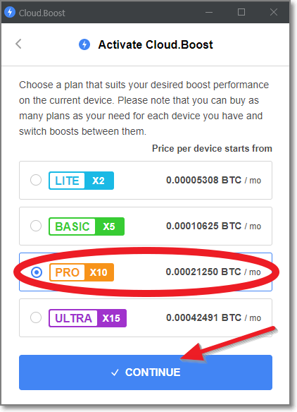 클라우드 부스트를 사용하기 위한 요금제가 나타나는데요. 10배의 해시값을 올릴 수 있는 PRO가 0.00021250BTC로 7000만 원 시세일 때 계산을 해보면 월 15000원 정도입니다. 제 PC의 경우 하루 24시간 120원을 채굴할 수 있는데 10 배면 1200원을 채굴할 수 있고 한 달이면 36000원을 채굴할 수 있는 것입니다. 월 15000원의 부스트 값을 빼면 2만 원 돈이 생기는 것입니다. "CONTINUE"를 누릅니다.