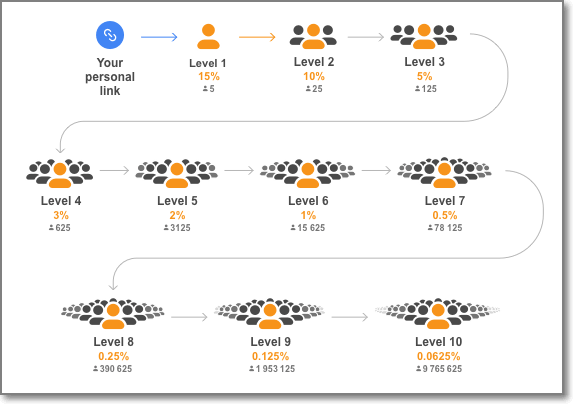 크립토 탭(CryptoTab)의 최대 강점은 바로 피라미드 방식의 추천 수익 방식입니다. 피라미드라고 하면 과거 우리나라의 피라미드 다단계 업체 등의 이미지가 있어서 어감이 나쁜 편이지만 크립토 탭의 피라미드 방식은 서로가 서로에게 이득이 되는 마이닝 풀의 방식에서 움직입니다. 아래의 그림처럼 5명씩만 추천인을 받아도 10 레벨까지 가면 무려 9765625명과 함께 마이닝 풀을 움직이게 됩니다. 수익도 그에 따라 늘어나겠지요.