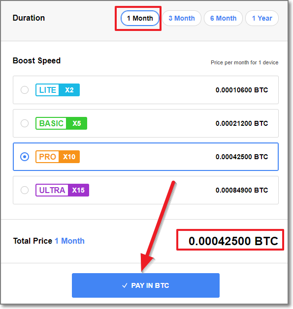 기간을 한 달로 하고 PRO(10배 해시 파워)를 선택한 상태로 "PAY IN BTC"를 누릅니다.