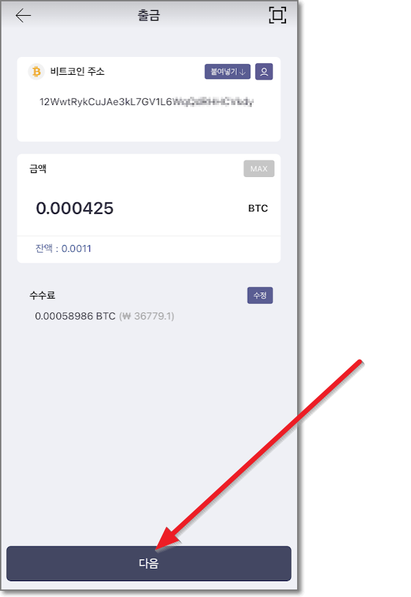 이제 코인 어스에서 정확한 금액 0.000425를 크립토 탭 클라우드 부스터로 보내보겠습니다.