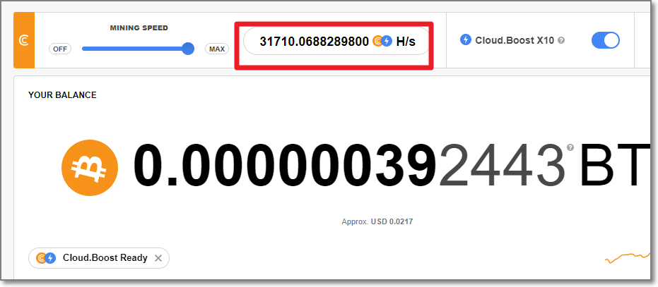 Mining speed(채굴 속도)를 MAX(최대)로 올려주세요. 그러면 오른쪽에 단위가 H/s라고 쓰여있는 수치가 보일 텐데요. H/s는 해시값이라고 하는 건데 채굴을 하는 기기의 능력을 보여주는 것이라고 이해하시면 됩니다. 이 해시값이 높을수록 많은 양을 채굴하게 되는 것입니다.(실제로 돌려보니 마이닝 스피드는 맨오른쪽에서 왼쪽으로 한칸 정도가 적당하네요)