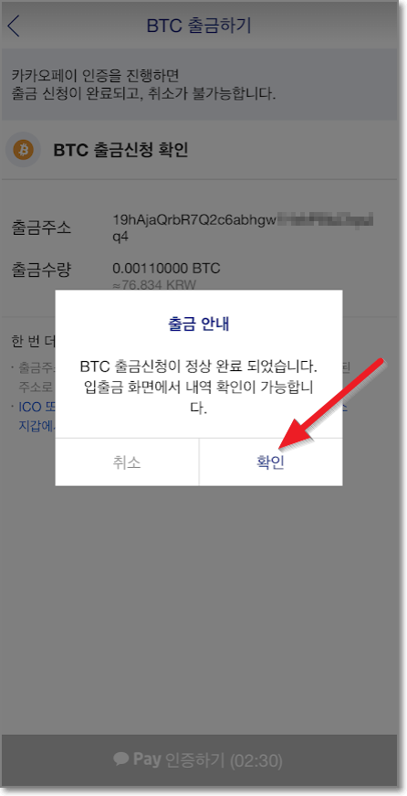 카카오페이 인증서 비밀번호를 입력하고 나서 업비트 앱으로 가보면 "BTC출금신청이 완료되었다"라고 나옵니다. "확인"을 누릅니다.