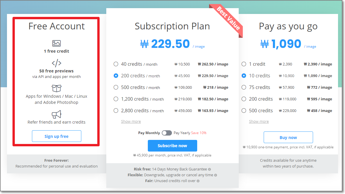 removebg는 제대로 된 사이즈(12메가 이상)와 계속적인 이미지 배경 지우기를 사용하려면 유료로 사용을 하게 되어있습니다. 200개 누끼 딸 비용을 미리 지불하면 45900원인데요. 우리나라 돈으로 이미지 1장당 230원 정도를 받고 있으며 이는 매월 지불해야 하는 돈입니다. 매월 결제가 아닌 한시적으로 필요하다면 이미지 1장당 1090원의 요금으로 할 수 있기도 합니다. 하지만 일반적인 사용자라면 1개 정도만 필요하기도 하고 12메가 이하이기도하니까 프리로 사용해도 괜찮을 듯합니다.