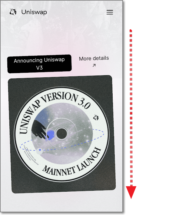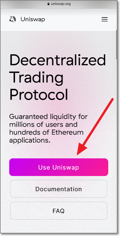 유니스왑은 URL이 uniswap.org입니다. 유니스왑 바로가기를 통해서 접속할 수 있으며 가짜 사이트도 있으니 유의하시기 바랍니다. 휴대폰에서 접속을 하면 아래와 같은 화면이 나오게 되는데요. 화면을 밑으로 내려서 Use Uniswap을 누릅니다. (PC의 경우에도 오른쪽 위에 보시면 Use Uniswap이 보이는데 이것을 누르면 됩니다.)