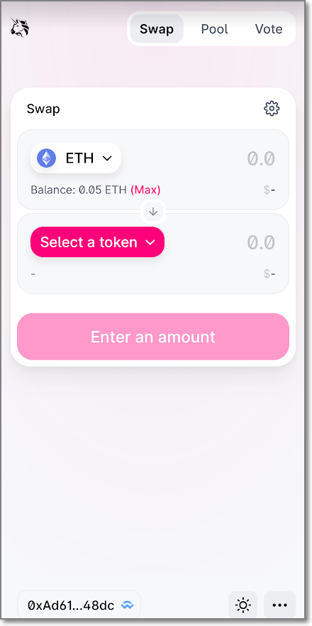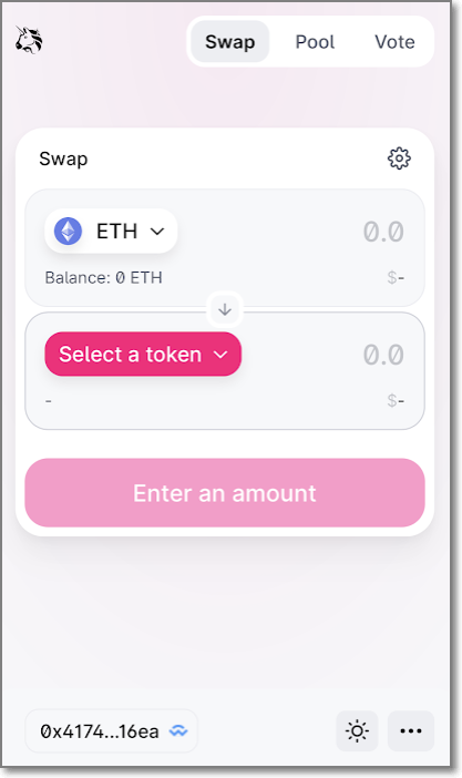 유니스왑에 암호화폐 지갑을 연결했기 때문에 Connet Wallet이 아니고 Enter an amount가 나오면, 이제 유니스왑을 사용할 준비가 다 되었습니다.