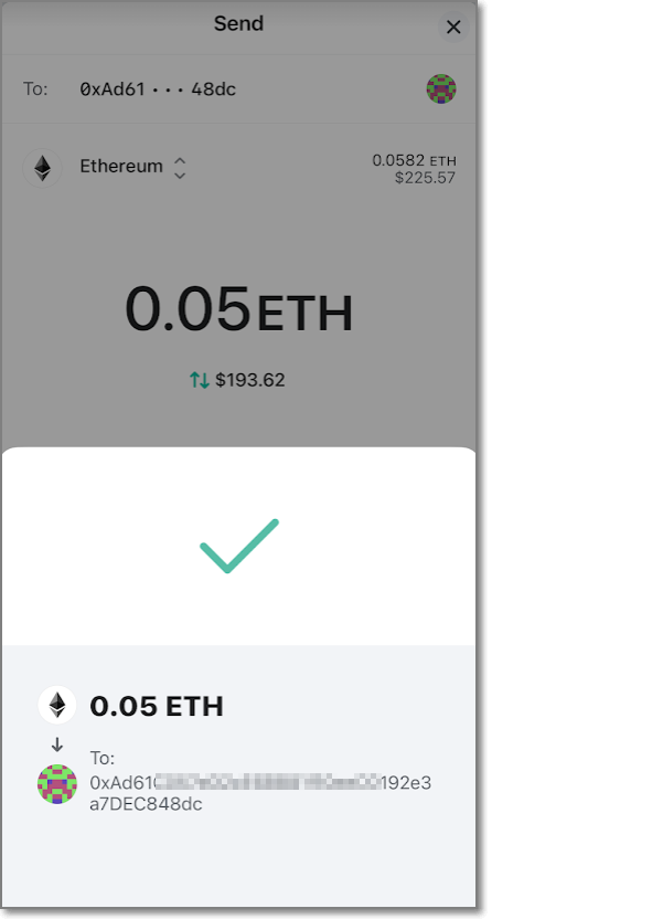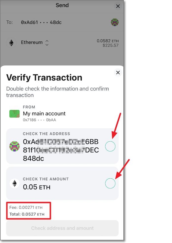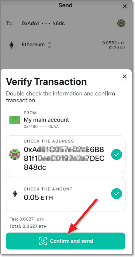 어디(메타마스크 지갑 주소)로 보내는지와 얼마를 보내는지 다시 한번 체크하는 화면이 나오는데요. 사실 은행계좌와 달리 암호화폐는 만약에 잘못 보내버리면 되찾을 수 있는 확률이 제로라고 해도 과언이 아닐 정도로 실수하시면 안 됩니다. 맨 마지막 글자가 (여기서는) 48dc인 것을 다시 한번 확인하고 보내는 금액도 0.05 이더가 맞는지 다시 한번 확인에 확인을 하고 Confirm and send를 누릅니다.