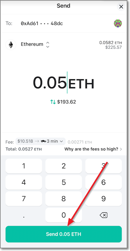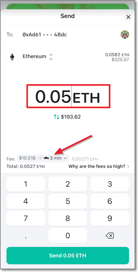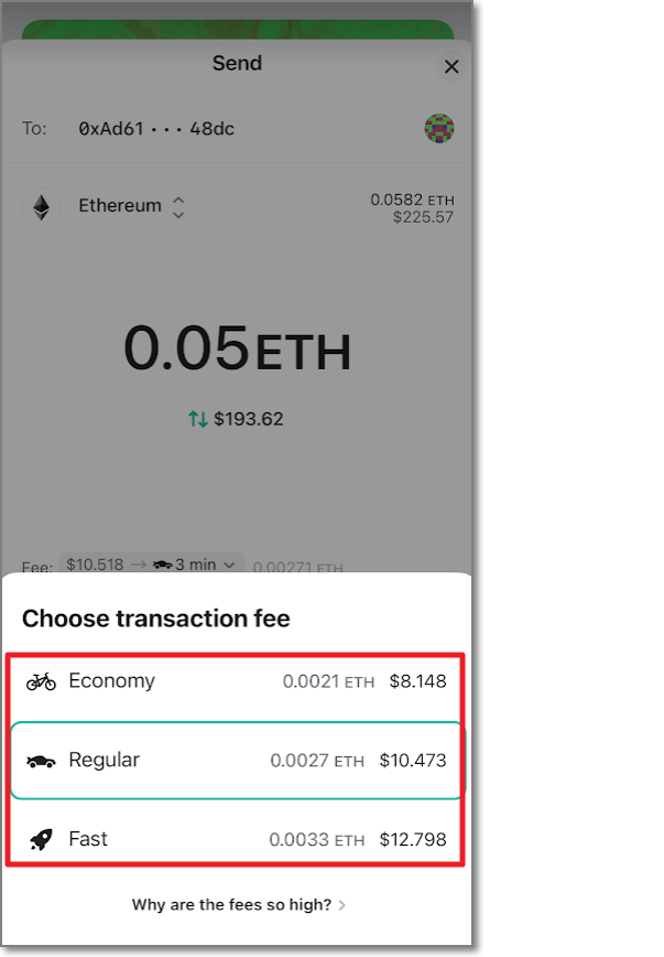 MEW의 송금수수료 정책이 보이는데요. 자전거(이코노미)는 0.0021 이더(8.148달러, 9200원), 자동차(레귤러)는 0.0027 이더(10.473달러, 11840원), 로켓(패스트)은 0.0033 이더(12.798달러, 14460원)입니다. 거래소 수수료를 보다 보니까 엄청 싼 것처럼 느껴지지만 수수료 아래 있는 글을 보면 요새 사람들이 왜 이렇게 이더리움 전송 수수료가 비싸냐고 항의하는 모양입니다. 여기서는 레귤러(11840원)로 보내보겠습니다. send 0.05 ETH를 눌러줍니다.