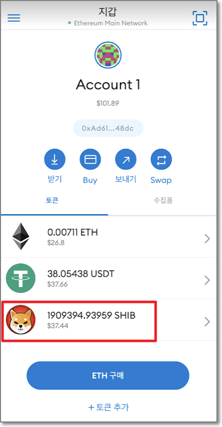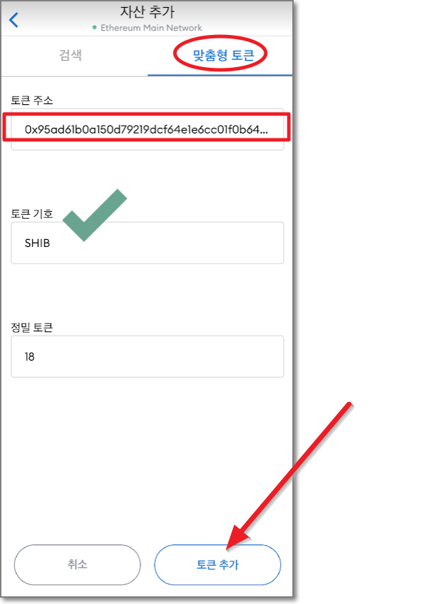 위에서 알아낸 시바이누의 컨트랙 주소를 메타마스크의 "맞춤형 토큰"에서 "토큰 주소"에 붙여 넣기 해주고 토큰 기호 쪽을 한번 터치하면 SHIB와 정밀 토큰(소수점을 말하는 겁니다) 란에 18이 써지게 됩니다. 밑에 있는 "토큰 추가"를 눌러주면 아까 보낸 금액만큼의 시바이누 코인이 들어있는 상태를 볼 수 있습니다.