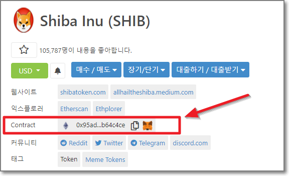 이번에는 시바이누 코인을 옮겼는데 메타마스크에서 보이지 않는 현상이 나타납니다. 사실 메타마스크는 코인을 등록을 해줘야 보유수량이 보이는데요. 시바이누는 메타마스크 코인추가를 해서 SHIB를 입력해도 보이지 않습니다. 이럴 때는 맞춤형토큰쪽에서 등록을 해줘야 하는데요. 등록하고자 하는 코인의 "컨트랙트 주소"를 알아야 합니다. CoinGecko에서 검색이 가능한데요. 시바이누 컨트랙주소 확인하기를 누르시면 바로 보실 수 있습니다. 코인겍코에서 아래처럼 나오면 컨트랙주소를 확인할 수 있습니다. 여기에 한번 더 써보면, 0x95ad61b0a150d79219dcf64e1e6cc01f0b64c4ce 입니다.