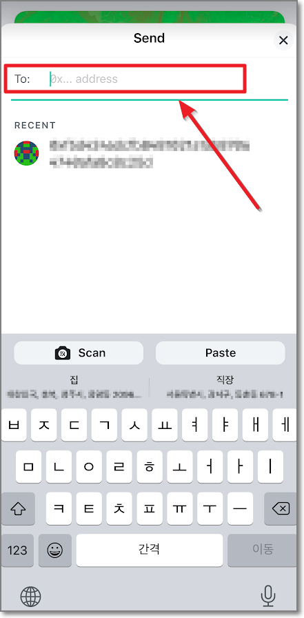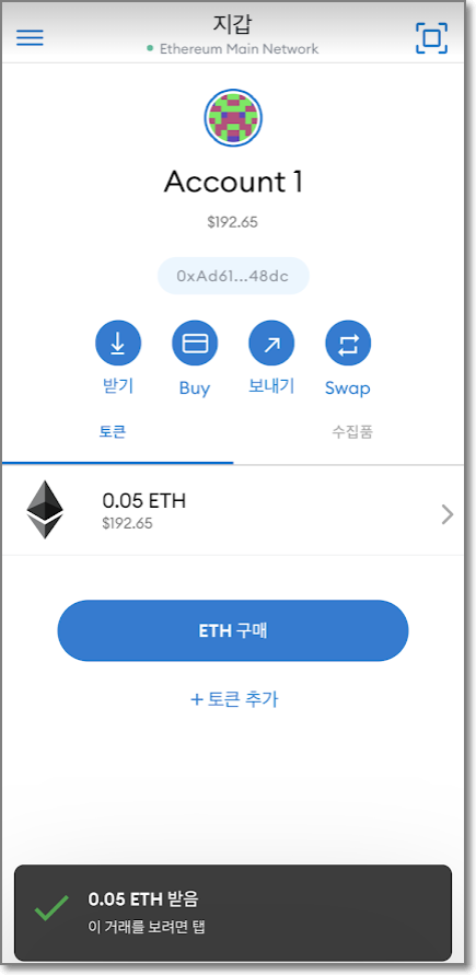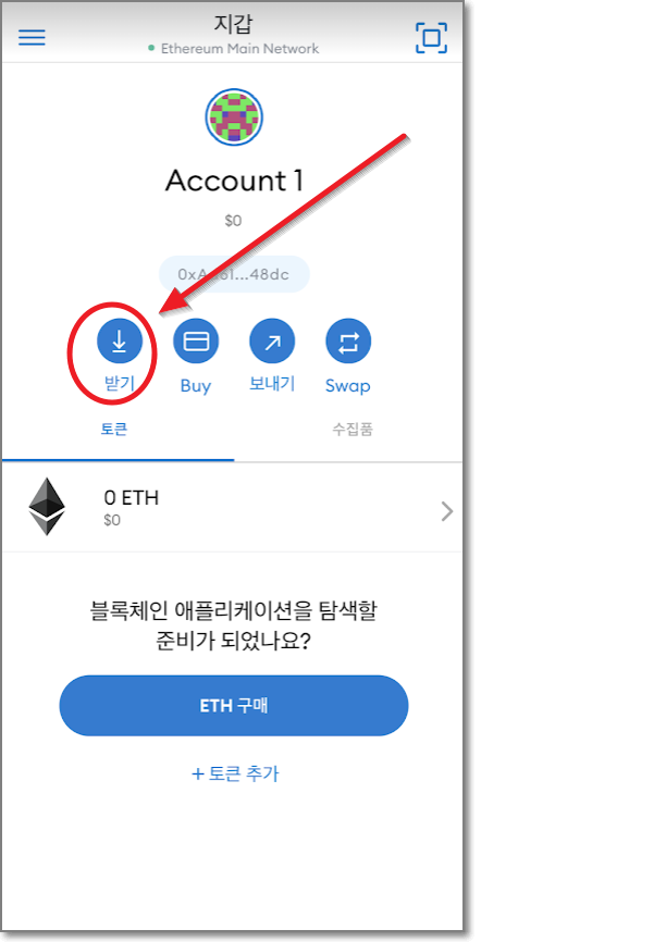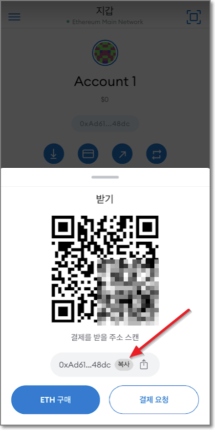 이번에는 메타마스크를 실행해서 받기를 누르고 QR코드 밑에 주소에 있는 "복사"를 누릅니다. 이때 맨 마지막 숫자와 문자를 기억하세요. 여기서는 48dc입니다. (바로 QR코드를 비춰도 되지만 같은 폰 안에서 돌아가고 있으니까 문자열을 복사해서 쓰겠습니다.)