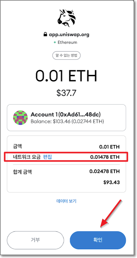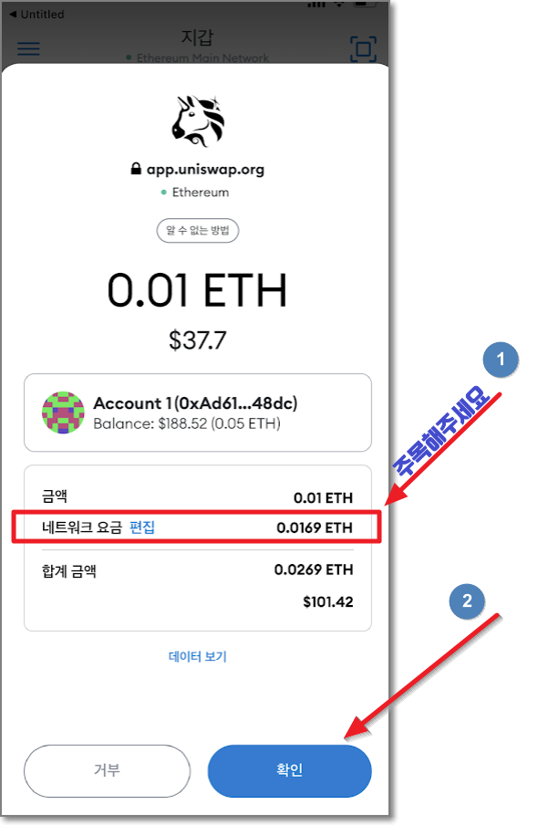 이제 유니스왑이 아닌 이더리움 네트워크를 움직이는 트랜잭션(처음부터 끝까지 진행되야만 완료되는 것을 지칭)이 빠르게 시작되는데요. 수수료가 엄청납니다. 0.01 이더 스왑 하는데 네트워크 요금이 무려 0.0169 이더입니다. 이더리움 시세가 500만 원이라고 가정하면 5만 원을 스왑 하는데 수수료가 84500원이 들어가는 것입니다. 사실 저도 잘 보지 않고 바로 "확인"을 눌러버려서 나중에 알게 되었습니다.