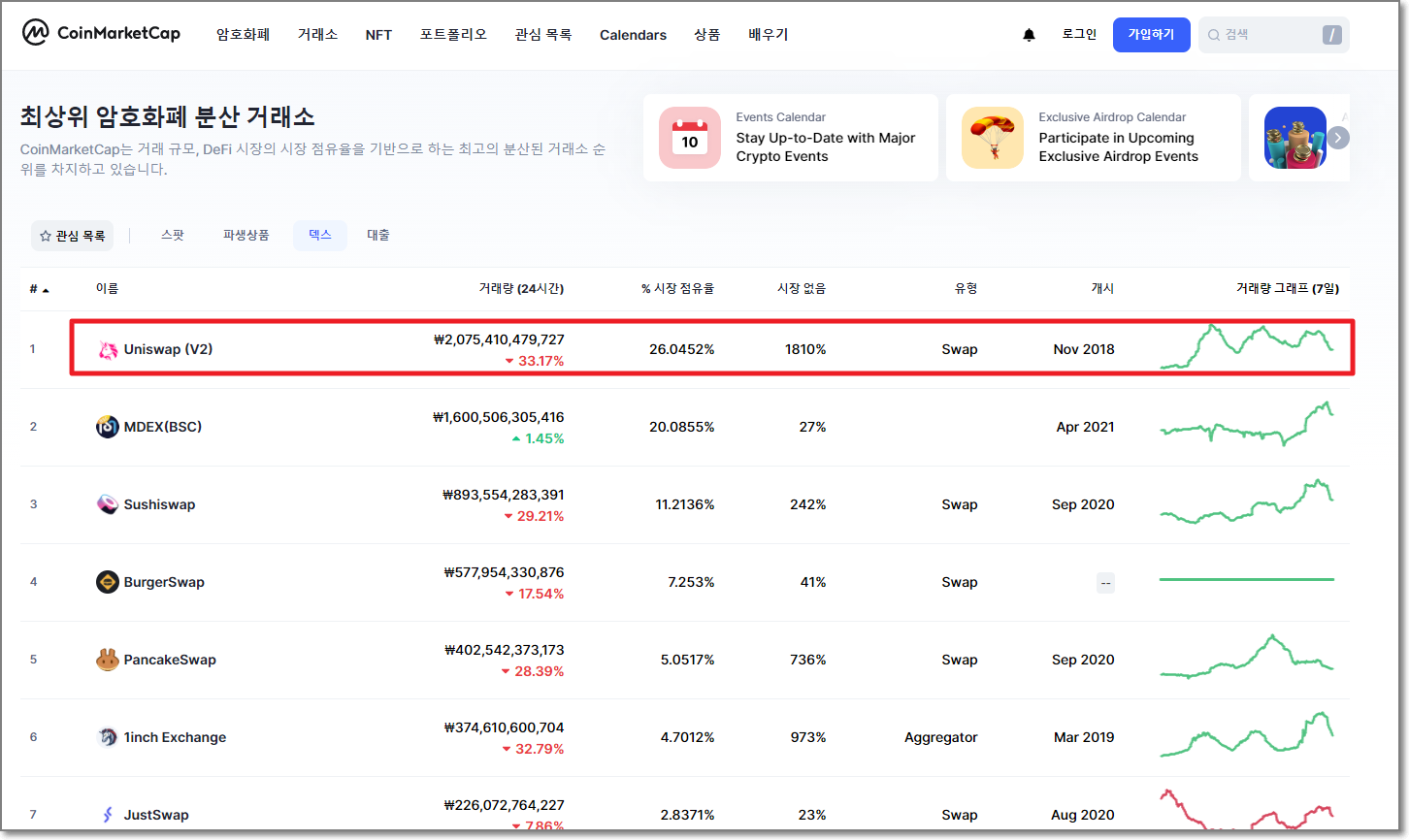 이번 시간에는 유니스왑(UniSwap)이라는 탈중앙화를 모토로 하는 암호화폐(가상자산) 거래소에 대해서 알아보도록 하겠는데요. 탈중앙화는 사실 비트코인이나 이더리움과 같은 암호화폐들이 원하는 미래입니다만 현재 많은 거래소들은 탈중앙화가 아니라 중앙에서 적극 통제를 하는 방식을 쓰고 있습니다. 가입할 때 신분증도 촬영해야 하고 휴대폰 인증도 해야 하지요. 하지만 유니스왑은 이런 것들 없이 완전한 개인과 개인 간의 거래를 할 수 있도록 만들어진 시스템입니다. 이러한 거래소들을 DEX(탈중앙화 거래소)라고 하는데요. 아래의 코인마켓캡 DEX거래소 순위를 보면 1등이 유니스왑임을 알 수 있습니다.유니스왑을 따라한 스시스왑도 있고 버거스왑도 있는 것을 볼 수 있습니다.
