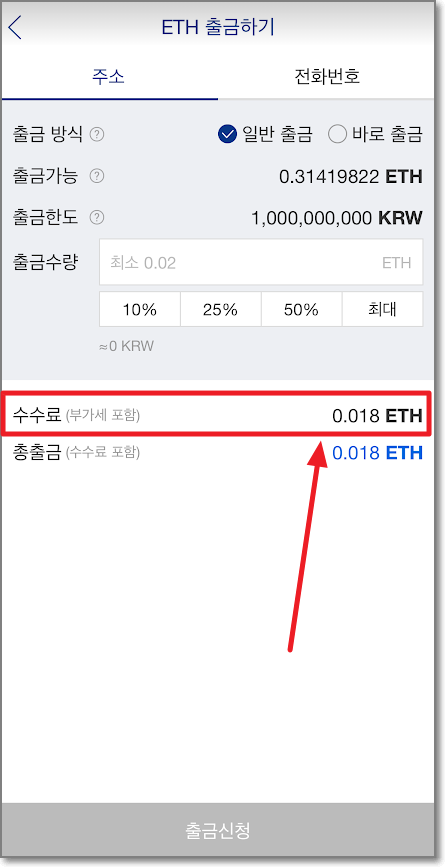 따라서 좀 느릴 수 있을지 몰라도 국내 거래소 빗썸이 그나마 이더리움 수수료가 0.01이니까(5만 원) 현금을 메타마스크로 보내고 싶으면 빗썸에서 보내는 게 가장 현명한 듯합니다.