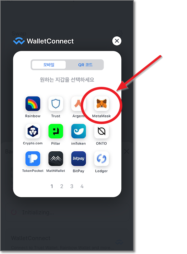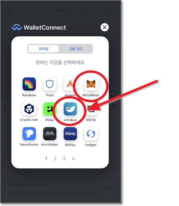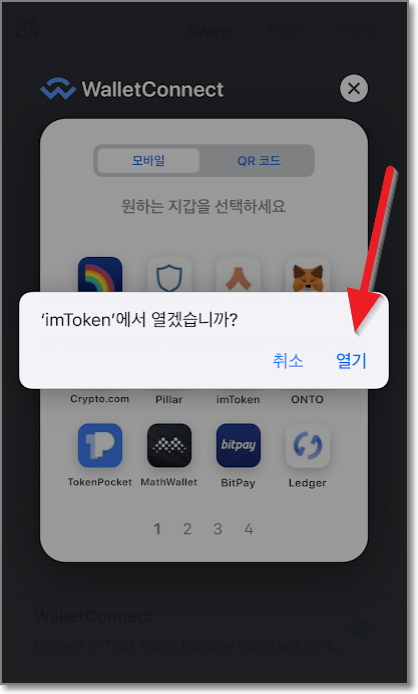 WalletConnet에 보면 꽤 많은 암호화폐 지갑이 보입니다. 친숙한 메타마스크(여우지갑)도 보이네요. 하지만 여기서는 우선 imToken을 사용해보겠습니다. 메타마스크 연결은 다시 밑에서 말씀드리겠습니다.