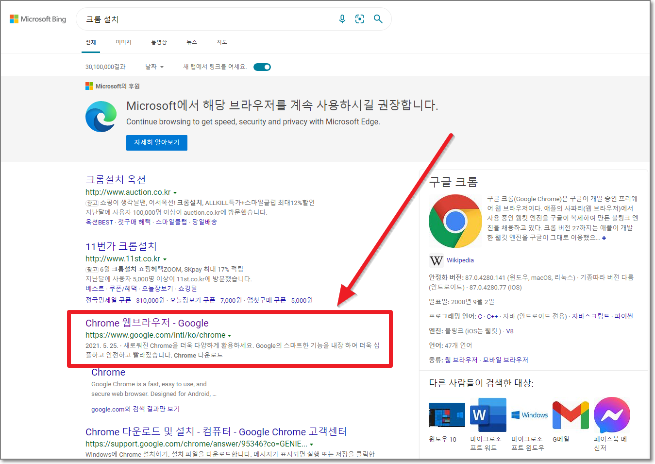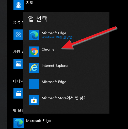 잠시 마이크로 소프트 엣지에 대한 창이 나오지만 닫아버리면 됩니다. 이제 기본 웹브라우저는 "크롬"으로 변경되었습니다.