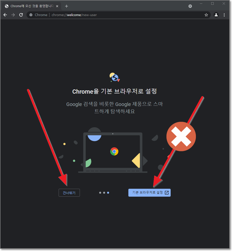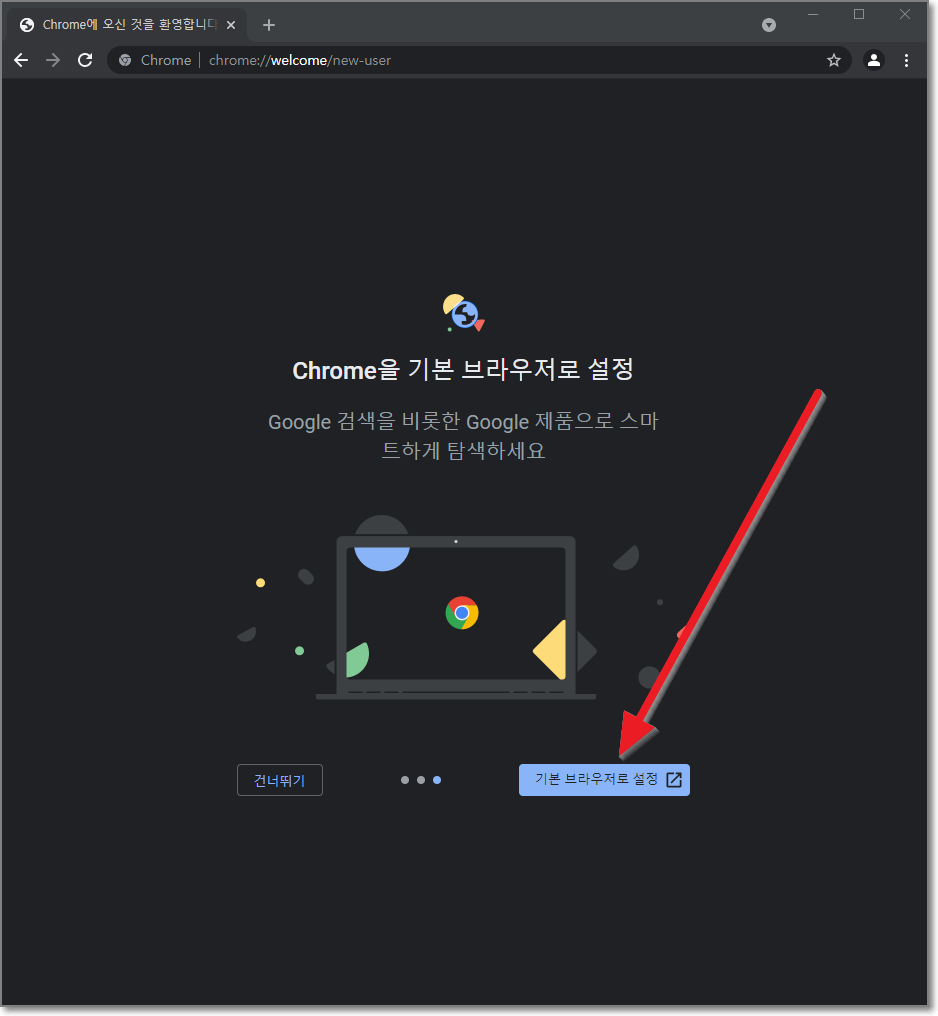 이제 다시 크롬으로 돌아와서 "기본 브라우저 설정"은 이미 했으니까, 왼쪽에 "건너뛰기"를 누릅니다.