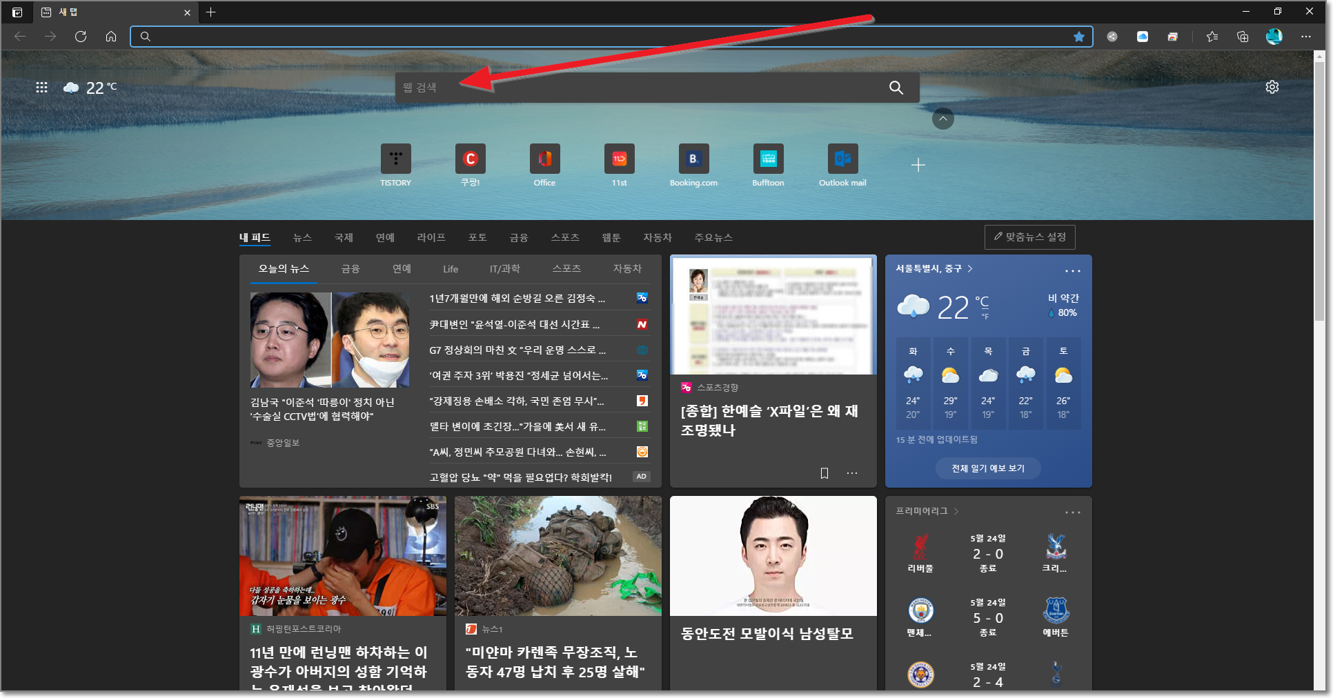 처음에 크롬이 없는 피시에서 인터넷을 실행하면(익스플로러 또는 엣지) 아래와 같은 화면이 보일 것입니다. 이 상태에서 검색창에 "크롬 설치"라고 입력하고 엔터를 누릅니다.