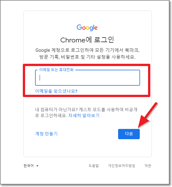 이메일 또는 휴대전화를 입력하고 "다음"을 누릅니다. 혹시라도 구글에 가입을 하지 않으셨다면 아래쪽에 있는 구글 계정 만들기를 참고해주세요.