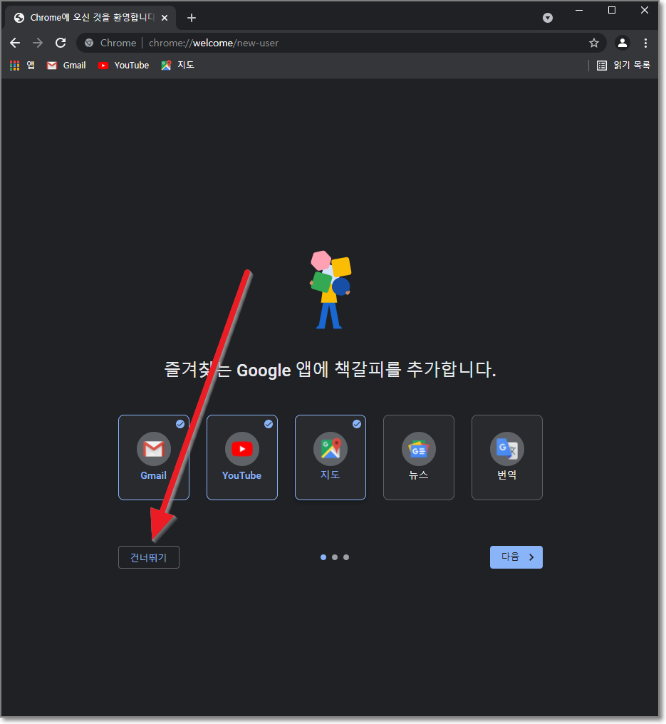 "즐겨 찾는 Google 앱의 책갈피를 추가합니다"에서 원하신다면 추가하셔도 되지만 "건너뛰기"를 하셔도 됩니다.