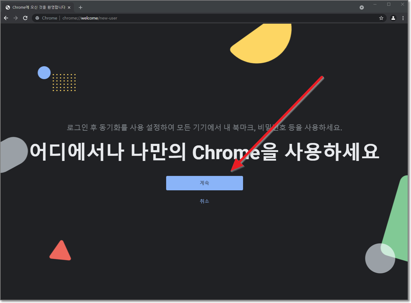 크롬의 기능 중에서 사무실과 집에서 같은 북마크, 같은 비밀번호를 사용해서 로그인 등 크롬에 로그인만 하면 항상 같은 환경으로 인터넷을 즐길 수 있다는 기능이 가장 편리한 기능입니다. "계속"을 눌러봅니다.