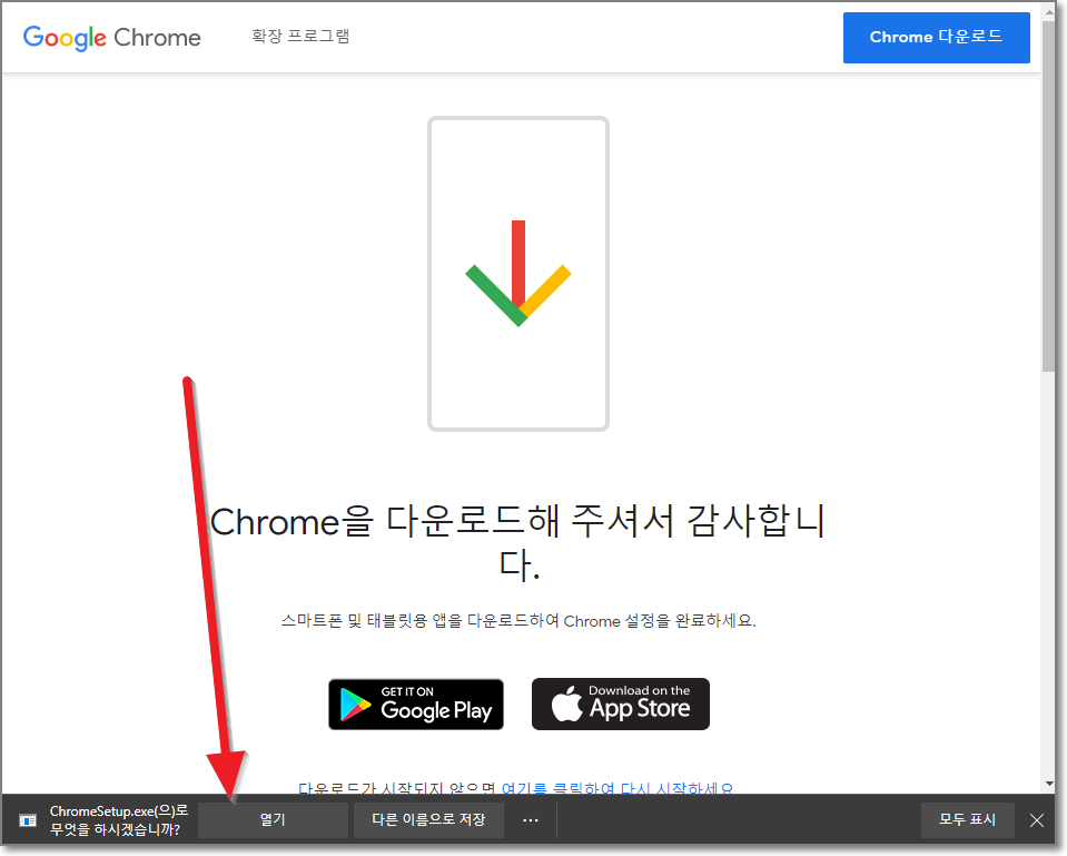 브라우저의 하단에 "ChromeSetup.exe(으)로 무엇을 하시겠습니까?"라고 나오는데요. "열기"를 누릅니다.