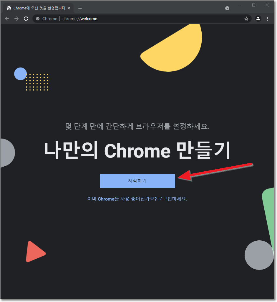 이 앱이 디바이스를 변경하겠냐고 나올 텐데요. "예"를 누릅니다. 그리고 나면 몇 초 지나지 않아 아래처럼 "크롬"이 실행되면서 그 자태를 드러냅니다. "시작하기"를 느릅면 됩니다.
