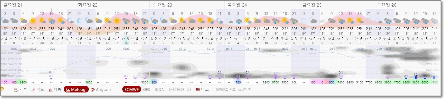 아래처럼 구름의 높이가 표시가 됩니다. 아래 예보대로라면 구름이 찐하게 덮여있어서 지상 위를 구름이 뒤덮인 모습을 예상할 수 있습니다.