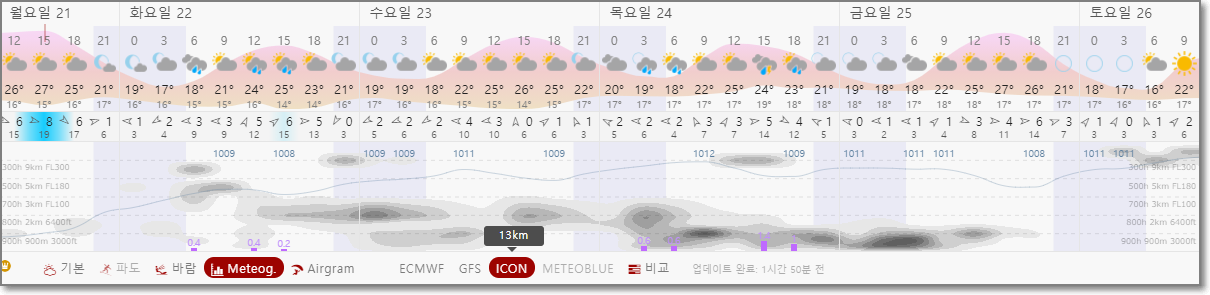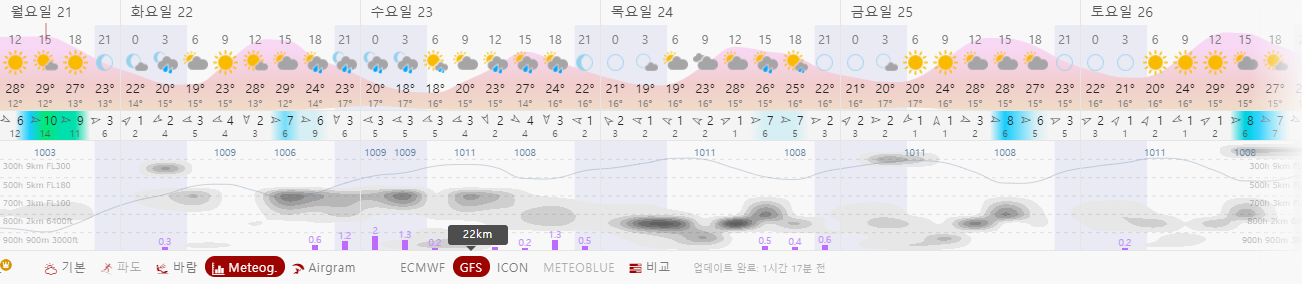 그리고 3군데의 기상예보 관측 모델 모두 화, 수, 목, 금을 모두 구름이 많이 낀 날씨라고 예보하고 있습니다.