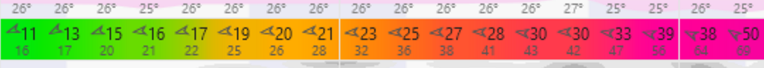 색깔 밑에는 두개의 숫자가 표시되어있는데, 큰 숫자는 바람이고 밑에 작은 숫자는 돌풍을 표현합니다. 보라색으로 갈수록 바람과 돌풍이 강해지는데 맨 오른쪽에 숫자를 보면 50노트의 바람과 69노트의 돌풍이 불고 있음을 알 수 있습니다.