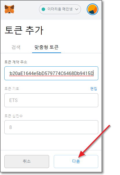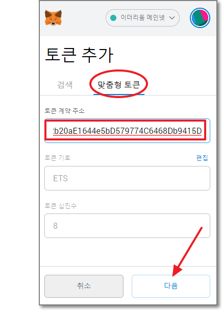 이제 이 컨트랙트 주소를 가지고 코인을 등록해야 하는데요. 아래처럼 메타마스크를 열고 "토큰 추가"를 누른 후에 "맞춤형 토큰"을 누르고 주소를 붙여 넣기 하면 코인 심벌과 소수점은 자동으로 나오게 됩니다. 여기서 "다음"을 누릅니다.