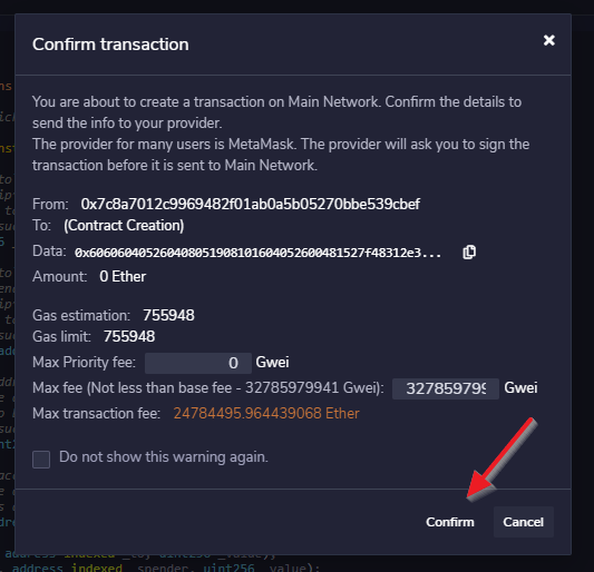 그러면 이제 아래와 같은 내용이 나오는데 수수료에 대한 이야기입니다. 메인넷에서 코인을 만들 때 수수료가 들어가는데요. 대략 많이 들어갈 때는 0.1 이더 정도 들어가고 대부분 0.07에서 0.09 이더 정도 소요가 된다고 알고 계시면 됩니다. 물론 "컨펌(confirm)"을 누르면 실제 이더(ETH)가 얼마나 소요되는지 그날그날의 네트워크 상황에 따라서 다르게 표시가 됩니다.