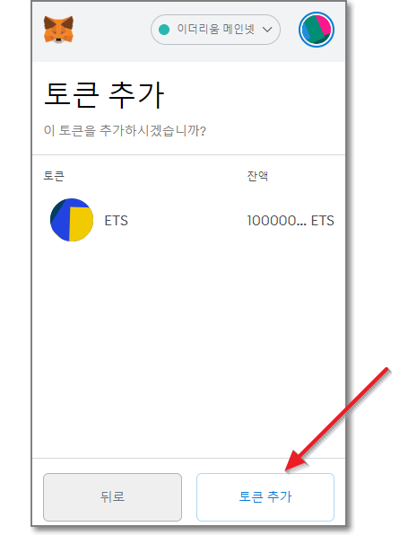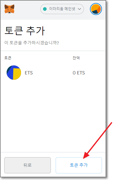 방금 만든 ETS 토큰이 보이는데요. 여기서 "토큰 추가"를 누릅니다.