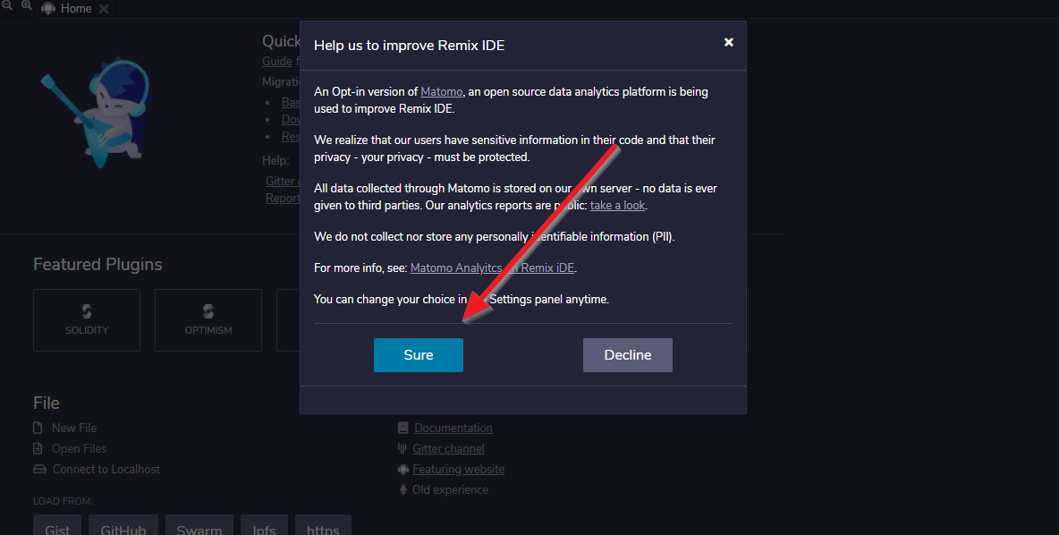 리믹스 IDE에 처음 접속하면 아래처럼 나오는데 SURE를 누릅니다.