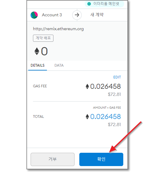 실제 소요되는 비용이 표시가 되는데요. 오늘은 네트워크 상황이 좋은 것 같습니다. 토털 0.026458 이더가 들어가네요. 얼마 전에 만들었을 때는 0.06 이더가 들어간 적도 있으니 충분하게 0.1 이더를 넣어놓으시면 모자람 없이 코인을 만드실 수 있습니다. "확인"을 눌러서 진행을 합니다.