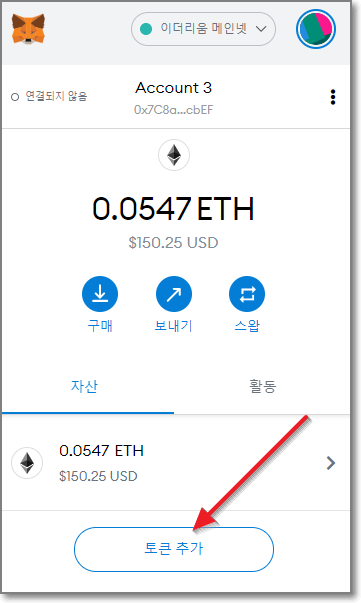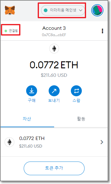 다음으로 넘어가기 전에 맨 위에서 설정했던 메타 마스크를 열어보면 아래처럼 되어있어야 합니다. 이더리움 메인넷이어야 하며 "연결됨"이라고 표시가 되어있어야 합니다. 만약 연결됨이 없으면 수동으로 리믹스와 연결해주어야 합니다.